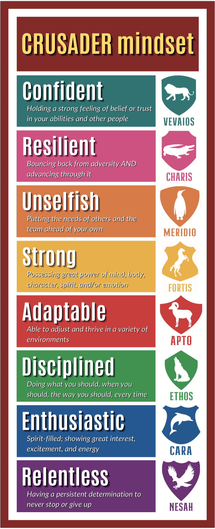We have 8 unique Houses, built based on our Crusader mindset, that students are started into on their first day of 6th grade. They will stay a member of that House until their last day of 8th grade. Within that House, students have an advisory family group of 20-25 students. Each House has about 100 students in it. Students attend House meetings, play games, compete, and do service projects within their House. Each House has 4 student house leaders and one adult House advisor who plan events, create traditions, and find ways to celebrate the wins of each member of their House.
