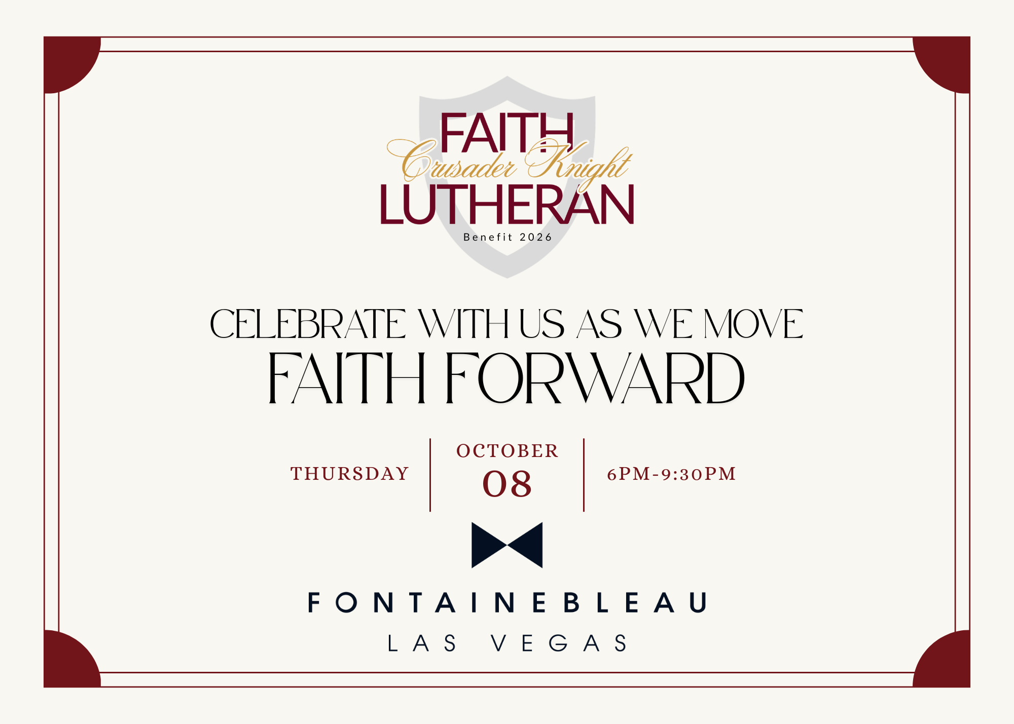 Join us for our annual Crusader Knight Benefit, an inspiring evening dedicated to celebrating our Faith Family and investing in the future of our students. Taking place this year at the elegant Fontainebleau Las Vegas, the night embraces our theme, Faith Forward, as we come together in faith, purpose, and generosity. Through fellowship, celebration, and giving, all proceeds from this event directly impact our students, empowering them to grow, learn, and thrive.
