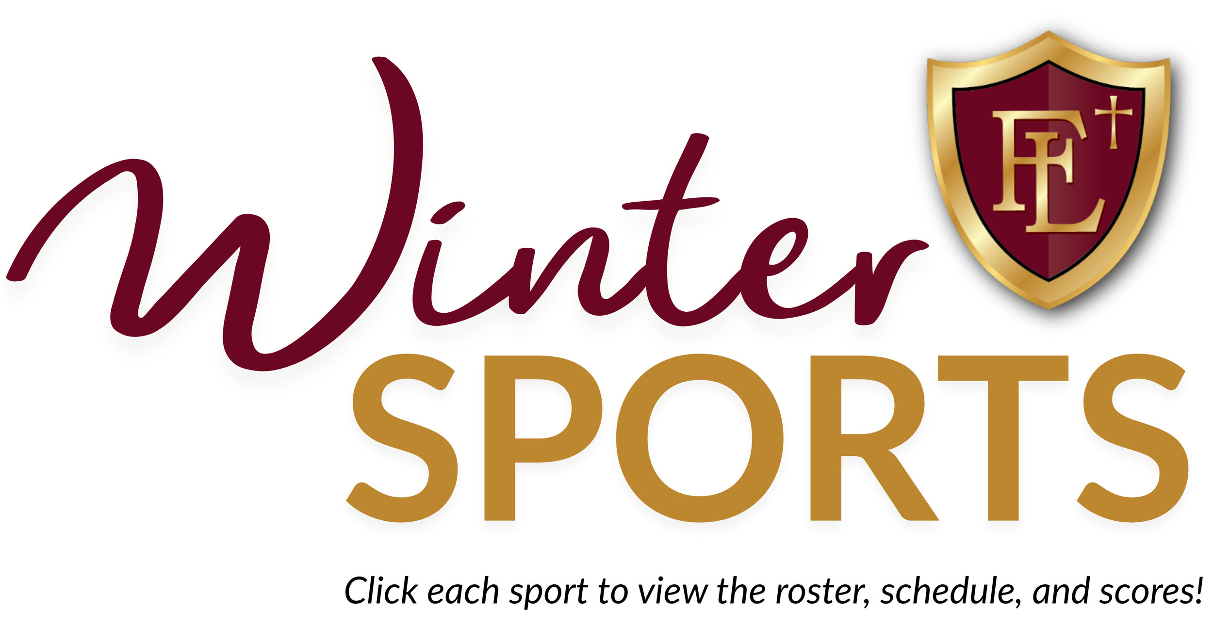 Winter Sports logo featuring burgundy and gold shield with the initials 'FE+' and text 'Winter Sports' in burgundy and gold. Small text below says 'Click each sport to view the roster, schedule, and scores!'